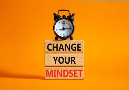 Change your mindset symbol. Concept words Change your mindset on wooden blocks with alarm clock. Beautiful orange background. Business and Change your mindset concept. Copy space.