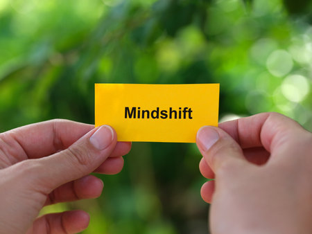 A woman holding a yellow paper note with the word Mindshift written on it in her hands against a foliage background. Close up.