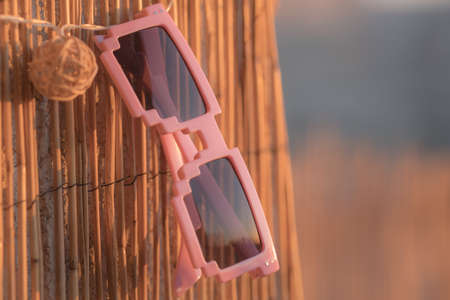 Pixel sunglasses model with black lenses closeup in a summer day. Selective focus