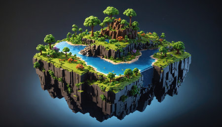 A floating island with a river and waterfall, surrounded by lush trees, rendered in a blocky style