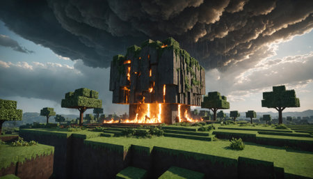 A burning, overgrown structure in a Minecraft world under a stormy sky