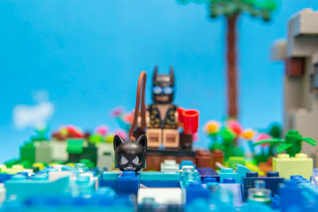 Florianopolis, Brazil. September 20, 2020: Batman minifigure fishing catwoman in lake. Concept of fishing love. Super heroes love it too. Selective focus.