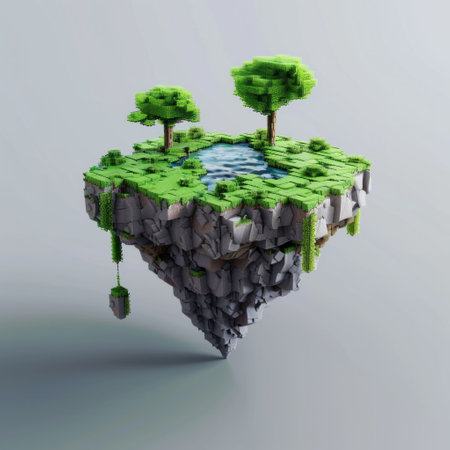 floating island, surreal landscape, nature, greenery, sky, beautiful scenery, digital art representation with lush trees and a serene pond, ideal for imaginative projects
