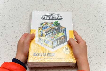 ZhongShan China-February 18,2020:kid holding set of books about the Minecraft.