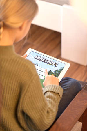 January 5, 2020, Kaliningrad, Russia. Little girl with blond hair start playing Minecraft game on Apple iPad Air. The problem of gambling addiction in children and adolescents.