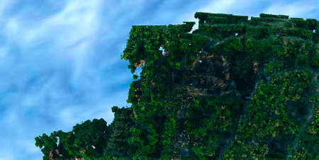 fractal rock of greenery on the background of the sky with clouds