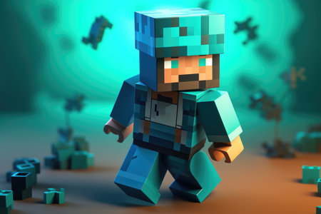 Kiev, Ukraine - January 30, 2019: Minifigure Steve with diamond sword and villager run away from the Creeper. Characters of the game Minecraft.