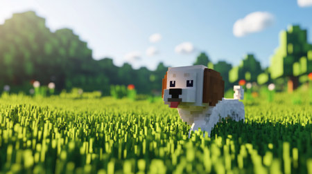 A playful blocky dog runs across a vibrant pixelated grassland, surrounded by lush greenery and a bright blue sky, creating a joyful scene in virtual world.