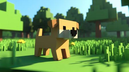 A charming 3D pixel art dog stands in a lush green field under a bright sky, surrounded by blocky trees, creating a playful and inviting atmosphere.