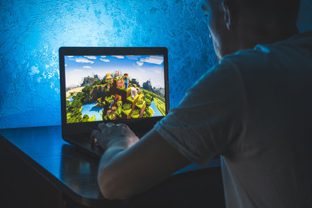 Kostanay, Kazakhstan, January 29, 2019.Person looks at the screen saver of the popular game Fortnite from Epic Games on Mobile.