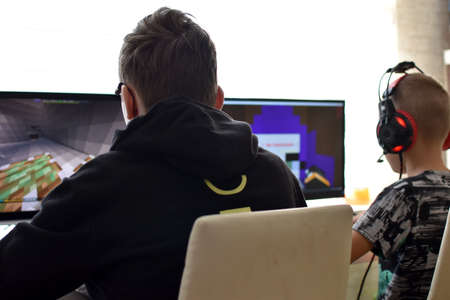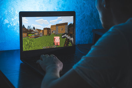 Bucharest, ROMANIA - May 10, 2021: Illustrative editorial concept image of a child playing Minecraft game on a mobile phone.