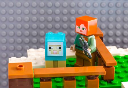 Tambov, Russian Federation - June 25, 2017 Lego Minecraft. Alex with sheep shears ready to shear the dyed sheep. Studio shot.