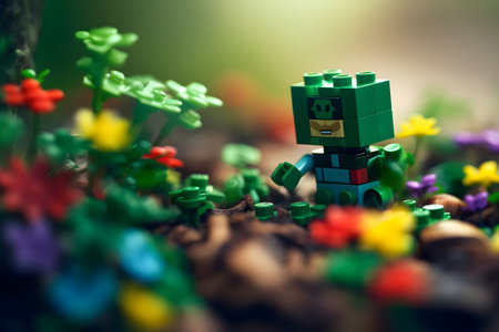 Lego minifigure standing on the ground among the green plants. Studio shot.