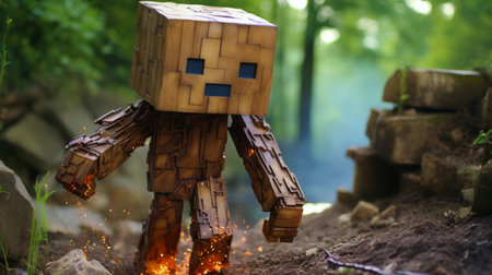 A close-up view of a unique, block-like character wearing a protective mask and a red and white striped shirt, positioned on a textured wooden surface.