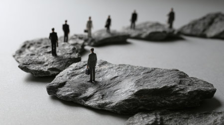 Small figures in business attire are positioned on a stone path, illustrating a journey of strategy and planning in a symbolic manner.