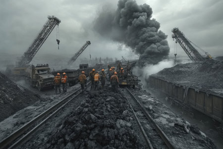 A group of miners in bright orange uniforms work diligently in a large coal mining area.