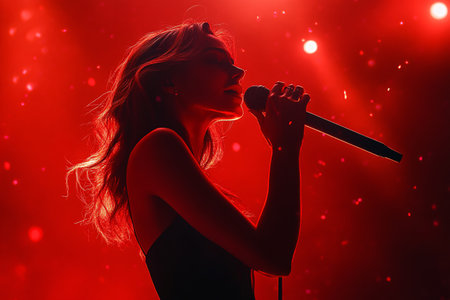 beautiful woman singer singing with microphone in red light