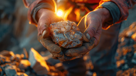 A miner stands holding a large lump of coal in his hands and wearing a helmet with a glowing flashlight