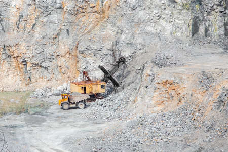 Excavator is loading raw materials into yellow truck for transport to combine. Stone open pit