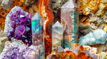 A stunning display of a vibrant collection of geode crystals featuring a variety of colors, patterns, and textures. This natural artwork captures the beauty of mineral formations, showcasing their unique shapes and intricate details. Perfect for geology enthusiasts and decorative purposes.