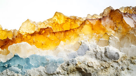 A close-up, detailed image of geothermal mineral layers, showcasing intricate patterns with vibrant yellow and contrasting blue hues, representing nature's artistry and geological processes.