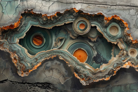 Explore the mesmerizing details of an agate geode in this close-up image. Vibrant layers in blue and orange highlight the natural beauty of this geological wonder.