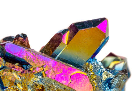 Macro mineral stone Titanium Quartz, Flame Aura Quartz on a white background close-up
