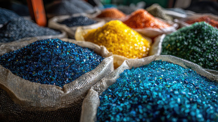 Vibrant granules are arranged in jute bags within an artisan workshop, perfect for crafting and artistic projects. A colorful display of creativity awaits.