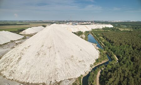 Summer landscape on the salt mountains against the blue sky. Mining industry. Extraction of silica from the ground near the city of Soligorsk in Belarus.