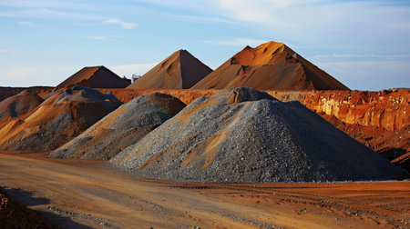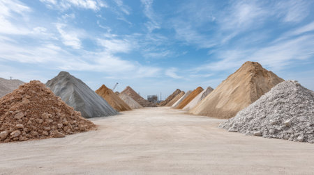 This image features an industrial construction site with various heaps of gravel and sand under a clear sky, emphasizing the natural textures and materials of the earth.