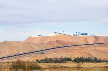 Giant spreader or absetzer machinery. A large dumper on a landfill with potash ore. Extracting and mining potassium salts. Large excavator machine and waste ore in the extraction of potassium.