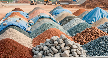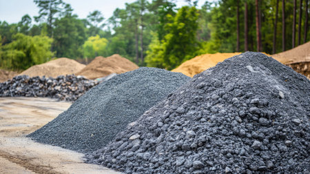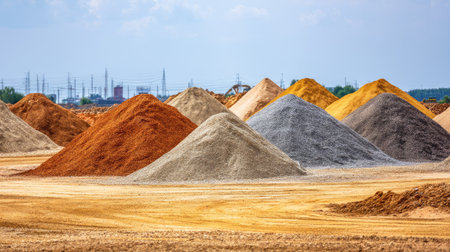 This vibrant image showcases diverse piles of sand and gravel under a clear blue sky, offering a striking depiction of construction materials in an outdoor setting.