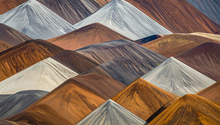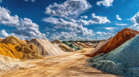 Vibrant mineral heaps create a visually striking landscape in a gravel yard. The various colors and textures highlight the raw materials used in construction and industry.