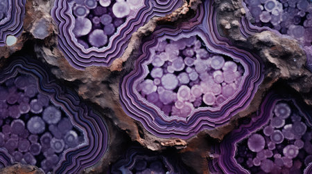 Geode inspired formation with complex colorful crystal formations on a rock background.
