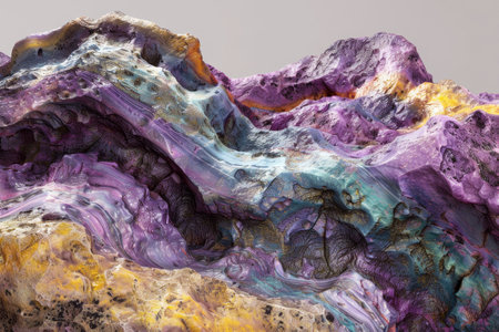 Colorful close-up of rock formation featuring vivid blue, purple, and gold textures, showcasing intricate patterns found in geological structures and minerals