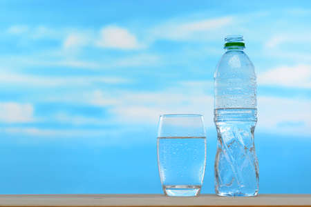 water in a glass and nearby there are bottles on a blue background. Cool soft drinks in summer in the heat. Clean drinking water. The balance of water. The rate of water consumption per day.