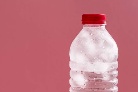 Plastic bottle with water and ice cubes close-up on a pink background. Cold natural water in a bottle. Fresh cold drink