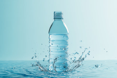 Clear water bottle splashes in blue water, creating ripples and droplets in a serene setting.
