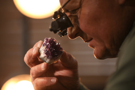 Professional jeweler working with beautiful amethyst indoors, closeup