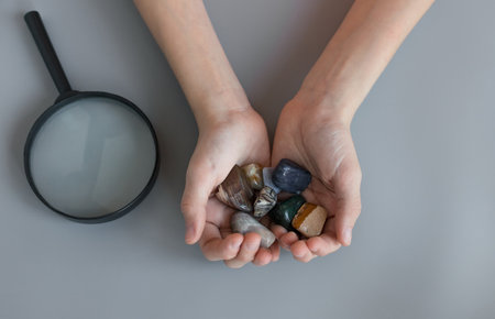 child holding collection of various semiprecious stones in hands on gray desk. Little Geologist, Education Concept. top view