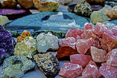 rare gems and minerals on a shelf in a souvenir shop and magic