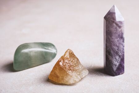 Beautiful amethyst crystals, round rose quartz stone and bostwana agate on a wooden background. Magic amulets.