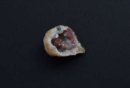 A beautiful geode with colored quartz crystals inside. Geological sample on a dark background.