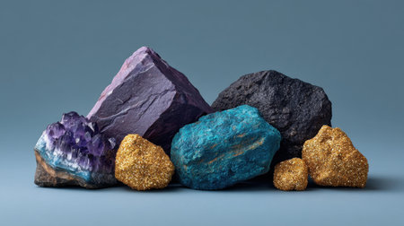 A striking arrangement of colorful crystals and rocks showcases vibrant shades of purple, blue, and gold against a soft blue background, perfect for enthusiasts and designers.