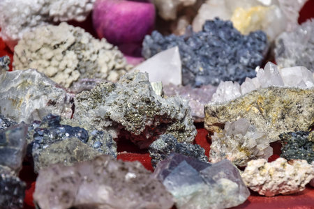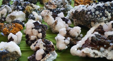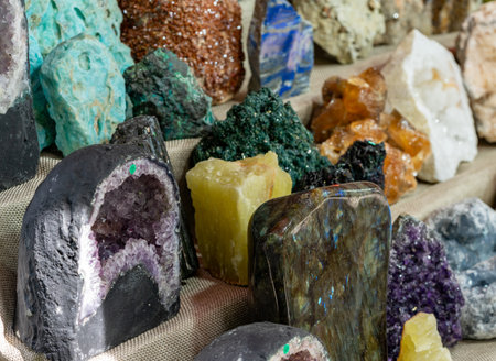 Crystals stones and minerals display. Variety of unique minerals specimens displayed on counter. Street trade. Close-up.
