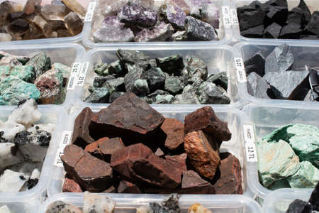 Collecton of crystals minerals in the museum showcase