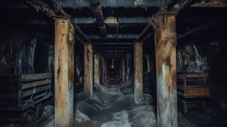 This image captures a dark, abandoned mine shaft featuring wooden supports and empty carts. The eerie atmosphere highlights industrial decay and an unwelcoming silence.