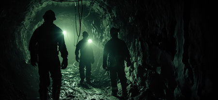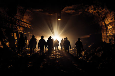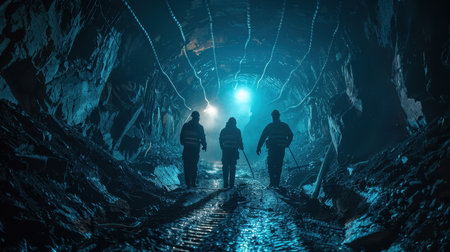 Silhouette of a group of people walking in the mine at night, Silhouette of miners with headlamps entering an underground coal mine, AI Generated