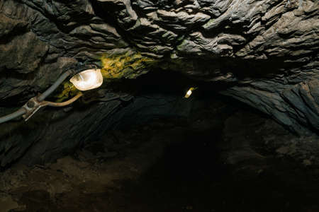 Beautiful cave. View from inside dark dungeon. Textured walls of cave. Background image of underground tunnel. Dampness inside cave. Lighting inside cave for excursions.