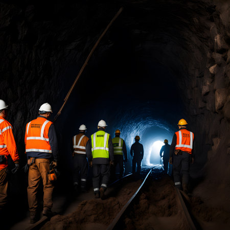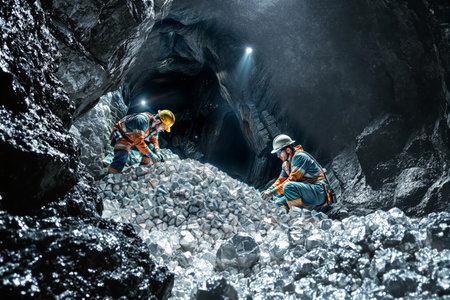 Underground mining tunnel illuminated by powerful industrial lights, with workers and heavy machinery extracting minerals.